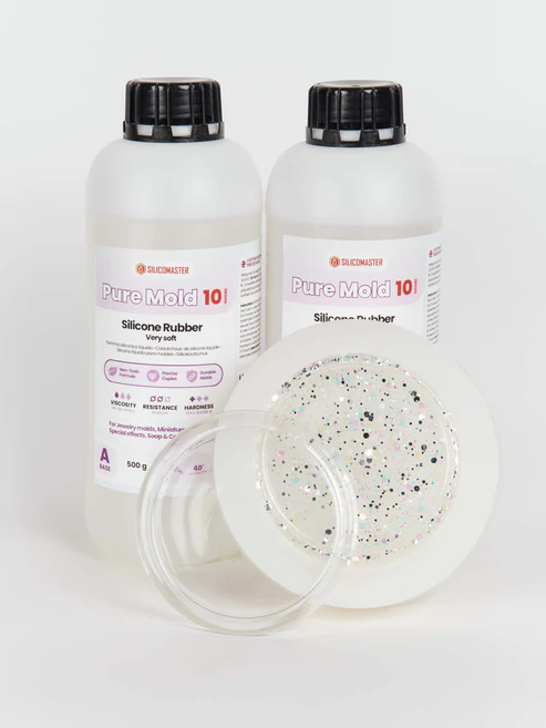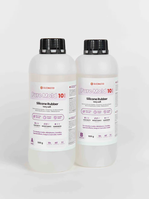 Pure Mold 10 è la gomma siliconica più morbida e versatile della gamma ResinPro®, con una durezza Shore A di 10±2 e un’elevata trasparenza. Ideale per creare stampi elastici e dettagliati, è perfetta per applicazioni in gioielleria, miniature, saponi artigianali e cosmetici solidi.