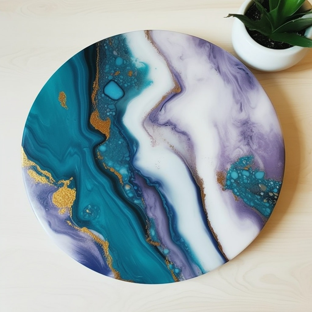 - Stratifica i colori in un unico grande contenitore senza mescolarli, permettendo loro di impilarsi uno sopra l’altro. Versa questo composto a strati sulla base in legno per un effetto dinamico e astratto. In alternativa, puoi versare ciascun colore su punti diversi della base in base al tuo concetto di design.
